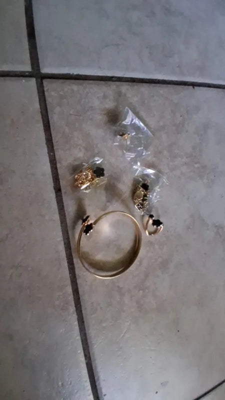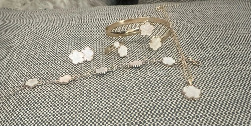 Prepárate para un glamour completo con 5 piezas: un collar deslumbrante, aretes a juego que enmarcan tu rostro, una pulsera chic, un anillo sofisticado y un brazalete elegante. Todo lo que necesitas para un look impecable y coordinado.