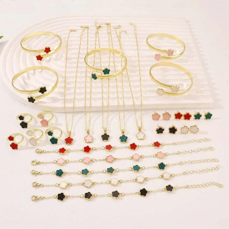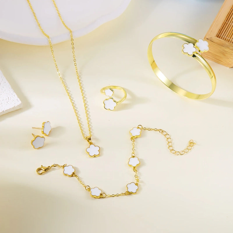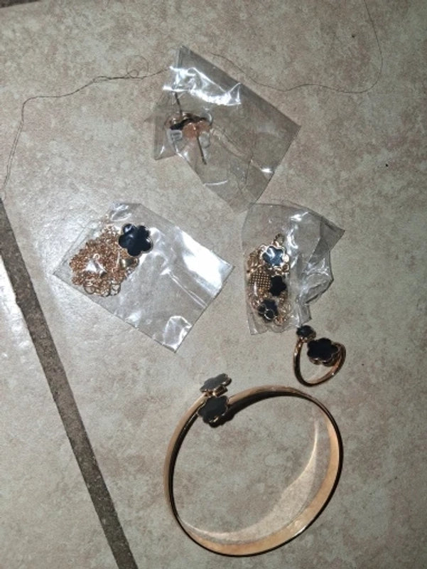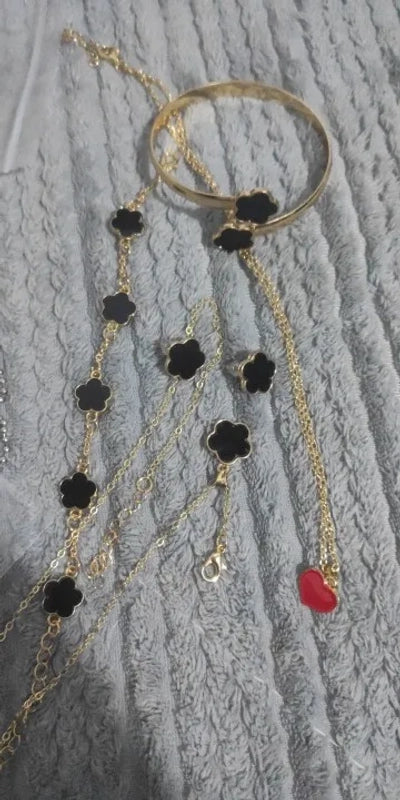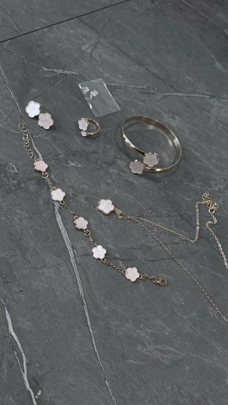 Recibirás un collar deslumbrante, un par de pendientes a juego, una pulsera chic, un anillo elegante y una esclava. Un conjunto completo para brillar.