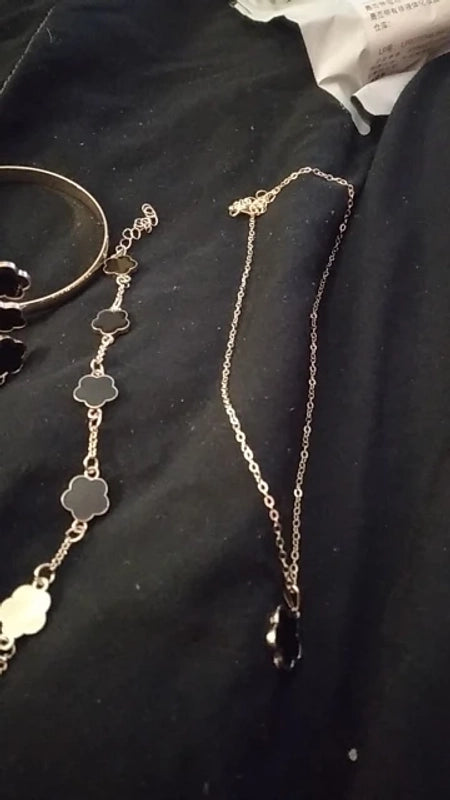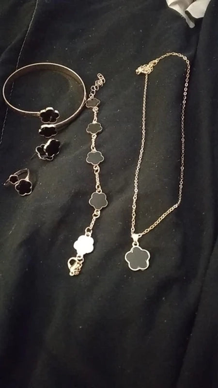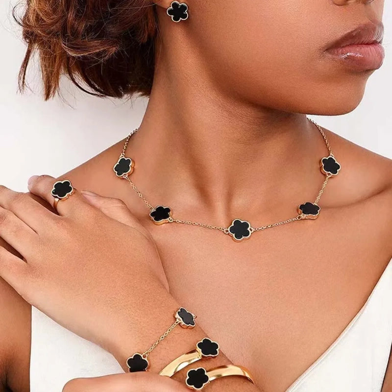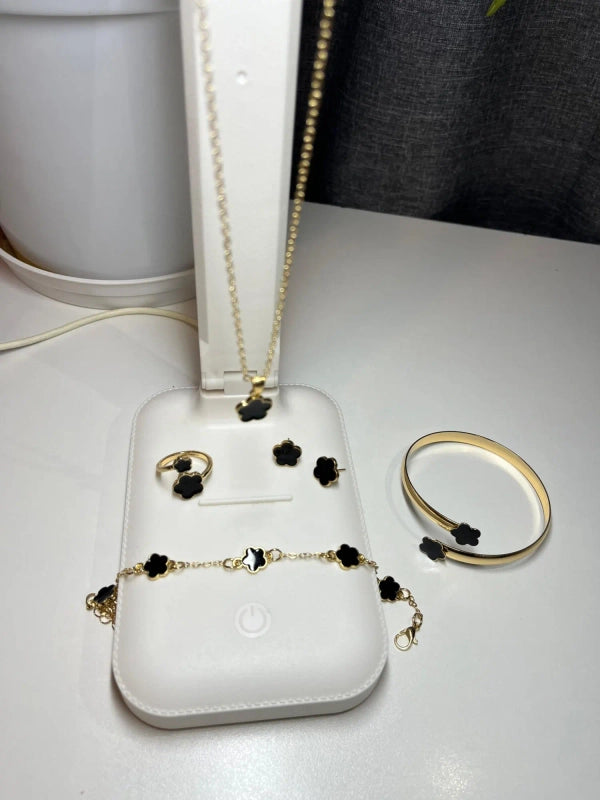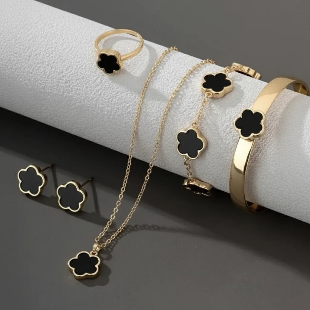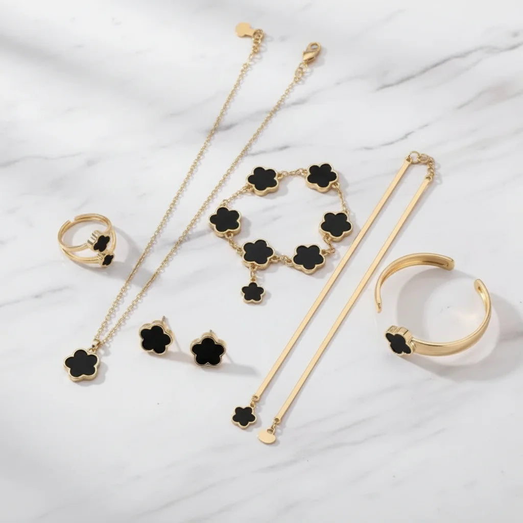 Con nuestro set de 5 piezas, cada salida será una declaración de estilo. Las delicadas flores de ciruelo en esmalte negro y oro te harán sentir la más sofisticada. Perfectas para fiestas, cenas o ese regalo especial que siempre soñaste.